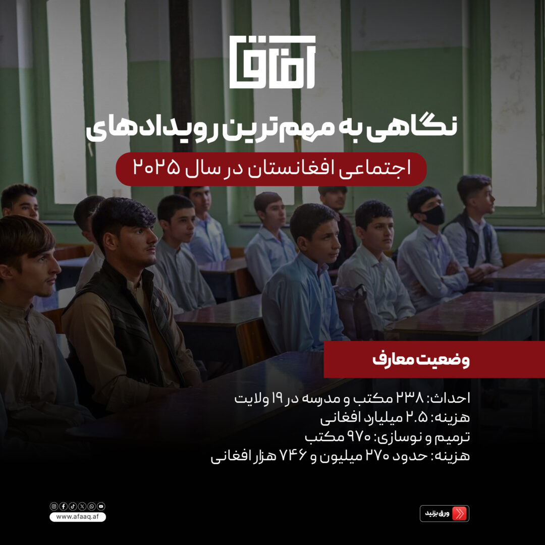 نگاهی به مهمترین رویدادهای اجتماعی افغانستان در سال 2025 11 جدی 1404 اینفوگرافیک Post Views: 3مطالب بیشتر: دستور آغاز چرخش در سیاست تجارتی کابل لینک کوتاه: https://afaaq.af/?p=17091 منتشر شده در 3:27 ب.ظ دیدگاهتان را بنویسید لغو پاسخنشانی ایمیل شما منتشر نخواهد شد. بخشهای موردنیاز علامتگذاری شدهاند *دیدگاه *نام ایمیل وب سایت Δ