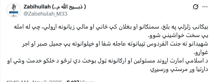 مجاهد: د اسلامي امارت اړوند ارګانونه او مسوولین د زلزله ځپلو په خدمت بوخت دي