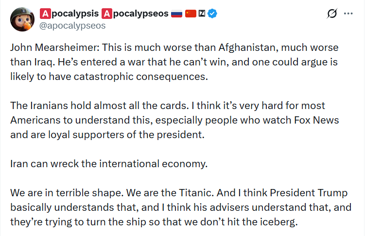 د سیاسي چارو امریکایي شنونکی جان میرشمیر وایي، د ایران پر وړاندې د امریکا جګړه، د واشنګټن لپاره د افغانستان او عراق له جګړو هم سختې او بوږنوونکې پایلې لرلی...