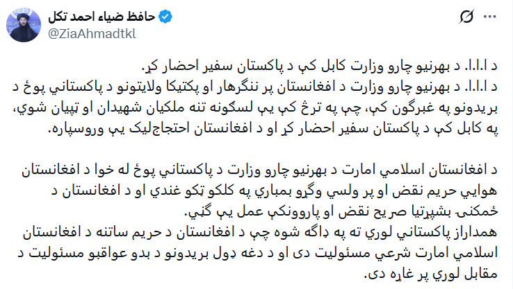 ضیا احمد تکل زیاتوي، چې پاکستاني لوري ته یې په ډاګه کړې چې د افغانستان د حریم ساتنه د افغانستان اسلامي امارت شرعي مسئولیت دی او د دغه ډول بریدونو د بدو عواقبو مسئولیت د مقابل لوري پر غاړه دی.