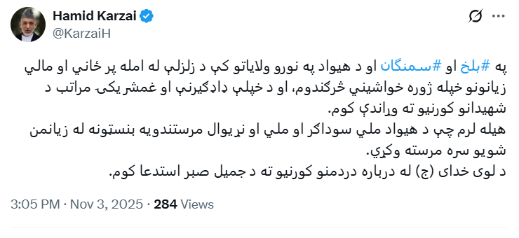 خانه / ټولنیزې شبکې / حامد کرزی سوداګرو ته؛ زلزله ځپلو سره مرستو ته را ودانګئ