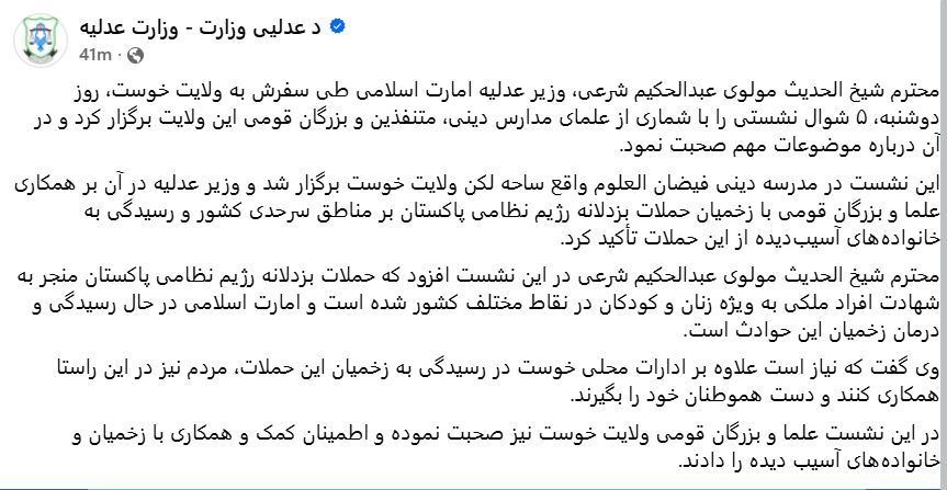 د عدلیې وزیر عبدالحکیم شرعي خوست کې له دیني علماوو، قومي مخورو او مشرانو سره ناسته کې ویلي، چې د پاکستان «پوځي رژیم» په بزدلانه بریدونو کې د ښځو او ماشومانو په ګډون ګڼو ملکي هېوادوالو ته مرګژوبله اوښتې ده.