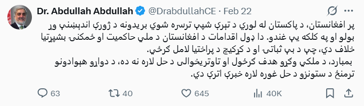 ښاغلي عبدالله پر خپله ایکسپاڼه زیاته کړې، چې دا ډول بریدونه بېثباتۍ او د کړکېچ پراختیا لامل کېږي او ټینګار یې کړی، چې د ملکي وګړو موخه ګرځول د ستونزو د حل لار نه ده.