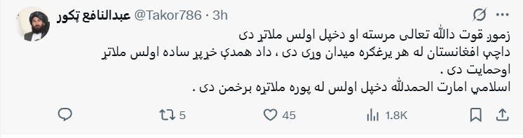 خانه / ټولنیزې شبکې / عبدالنافع ټکور: موږ د ولس په مرسته له هر یرغلګر میدان ګټلی دی