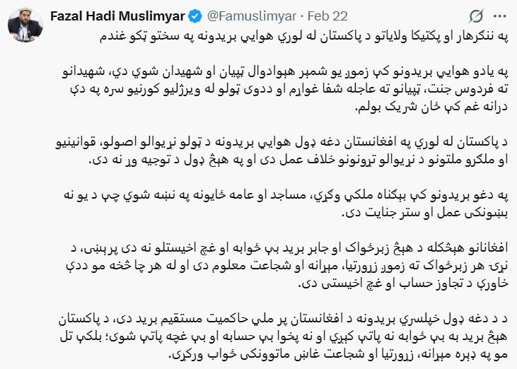 د پخواني حکومت پر مهال د مشرانو جرګې مشر فضلهادي مسلمیار د پاکستاني پوځ بریدونو ته په غبرګون کې ویلي، چې دغه ډول هوایي بریدونه د ټولو نړیوالو اصولو، قوانینیو او ملګرو ملتونو د نړیوالو تړونونو خلاف عمل دی او په هېڅ ډول د توجیه وړ نه دي.