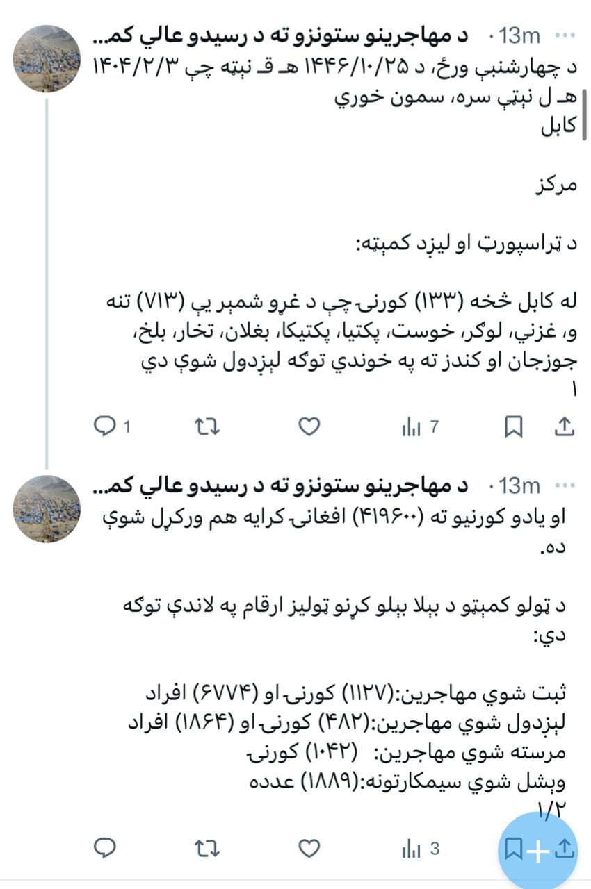 پرون له کابل ۱۳۳ کورنۍ خپلو اصلي سیمو ته لېږدول شوې او څه باندې څلور سوه زره افغانۍ مرسته ورسره شوې