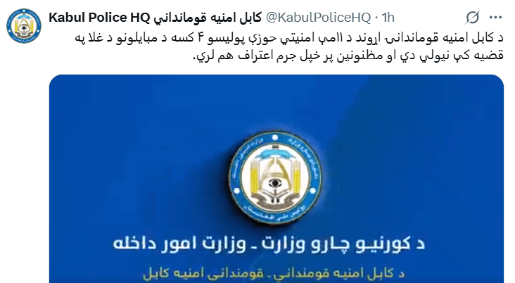 کورنیو چارو وزارت: د کابل ښار یوولسمه حوزه کې مو د مبایلونو غلا په تور څلور کسان نیولي او په خپلو جرمونو یې هم اعتراف کړی