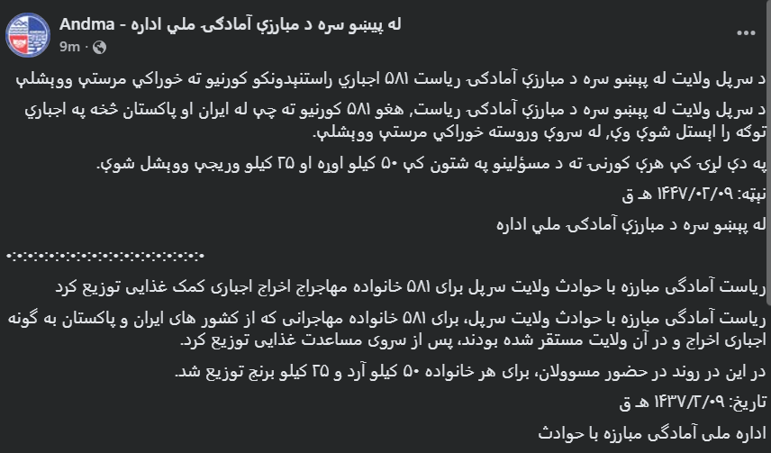 سرپل کې ۵۸۱ کورنیو سره د خوراکي توکو مرسته وشوه