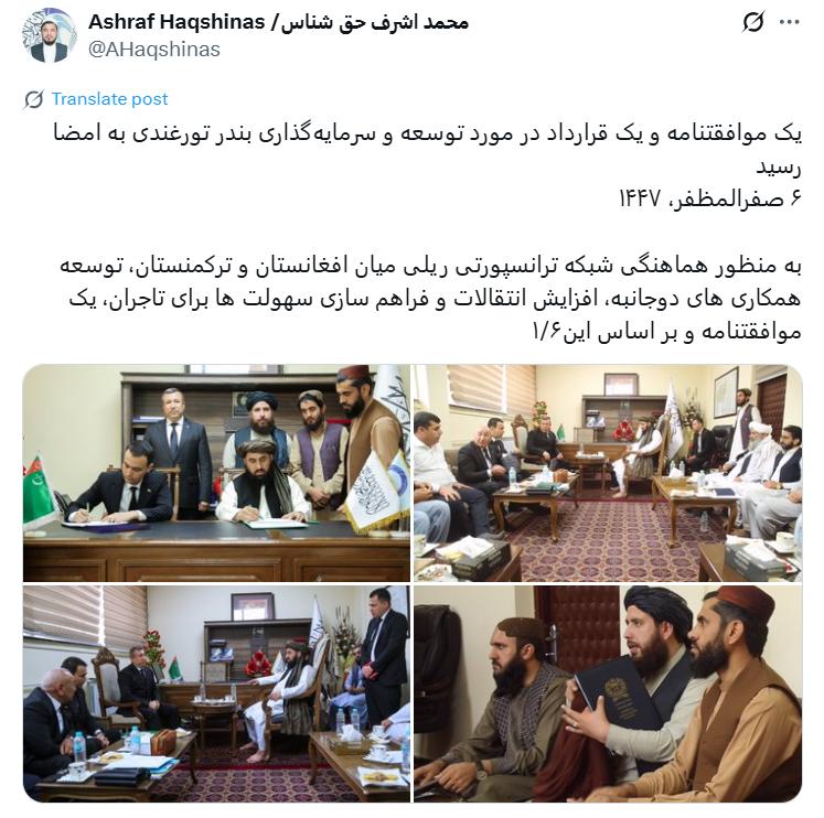 د تورغنډۍ بندر پراختیا په موخه ترکمنستان سره یوه هوکړه او یو تړون لاسلیک شول