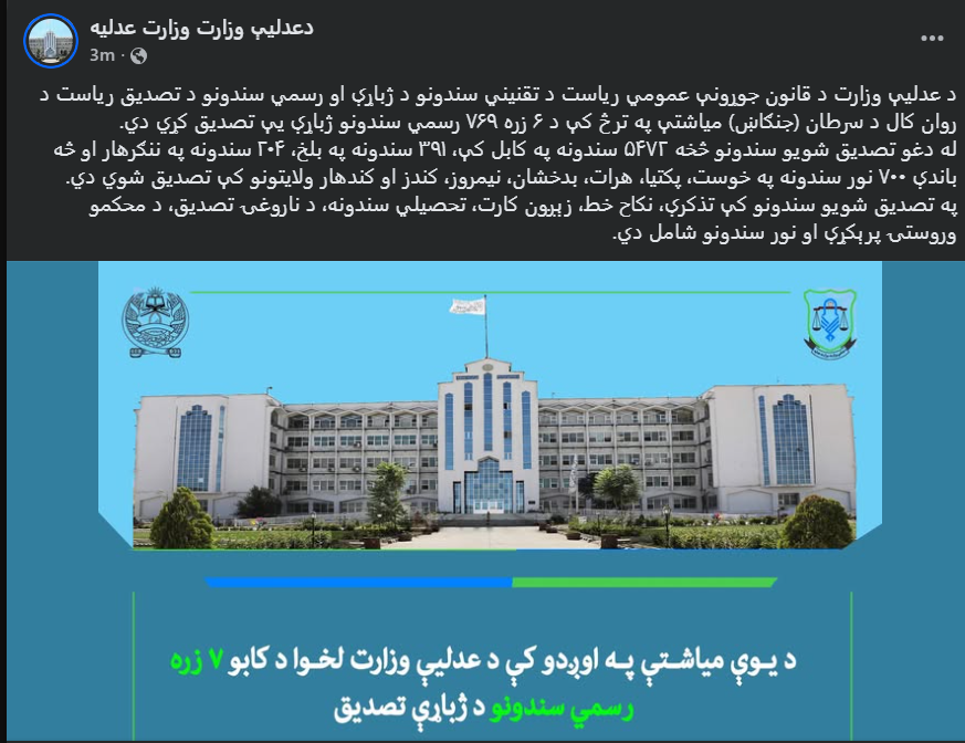 عدلیې وزارت یوه میاشت کې نږدې ۶۸۰۰ رسمي سندونه تصدیق کړي