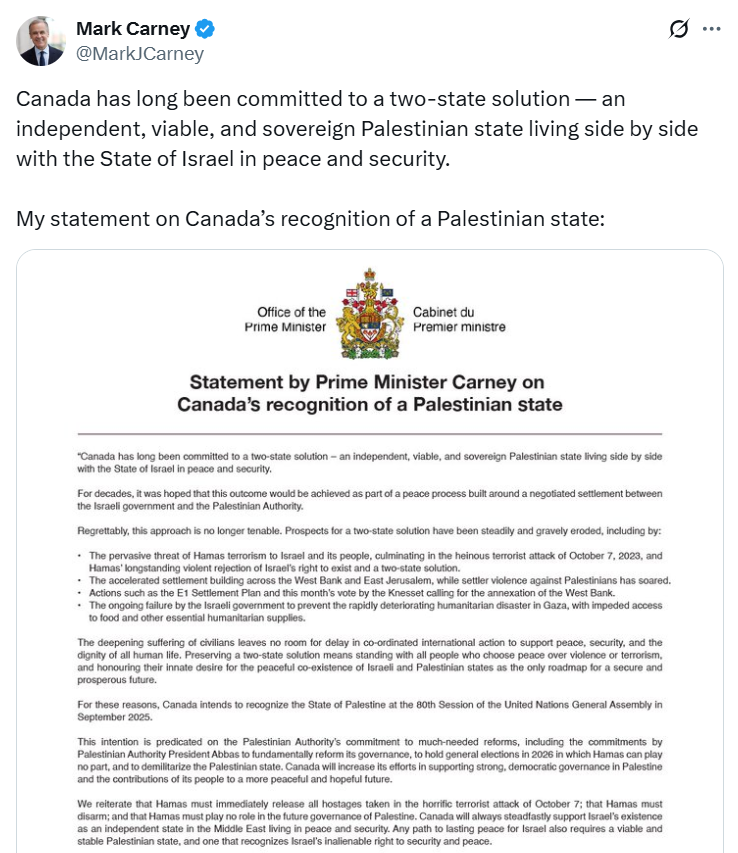تر فرانسې او انګلستان وروسته؛ کاناډا هم سپټمبر کې د فلسطین رسمیت پېژندلو پرېکړه کوي
