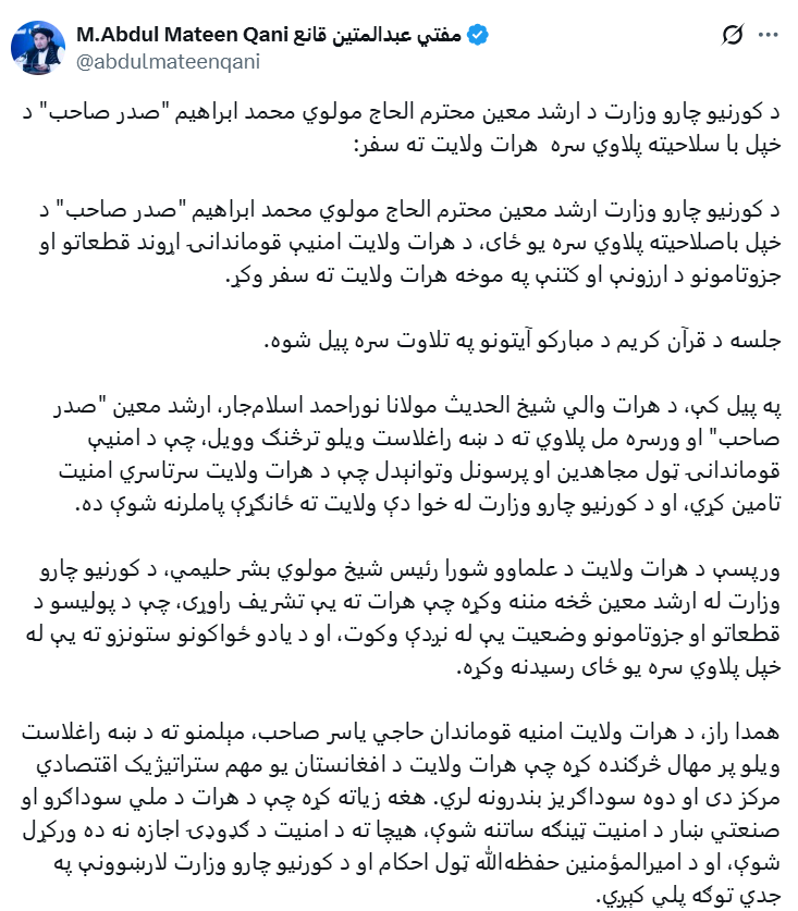 ابراهیم صدر هرات کې د ټولو اوامرو او فرامینو پر یو شان تطبیق ټینګار کړی