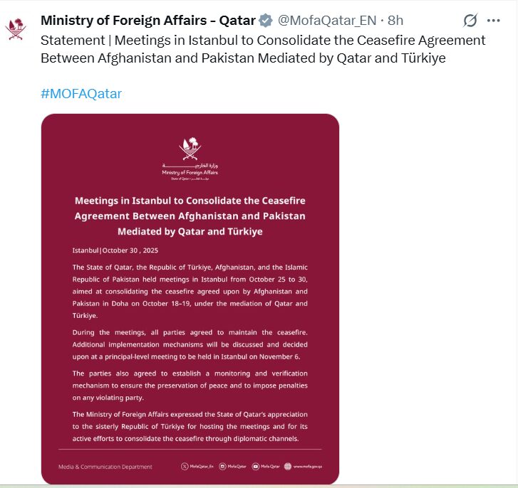 د استانبول مذاکرات؛ اوربند به دوام کوي او د نومبر په شپږمه به خبرې بېرته پیل شي