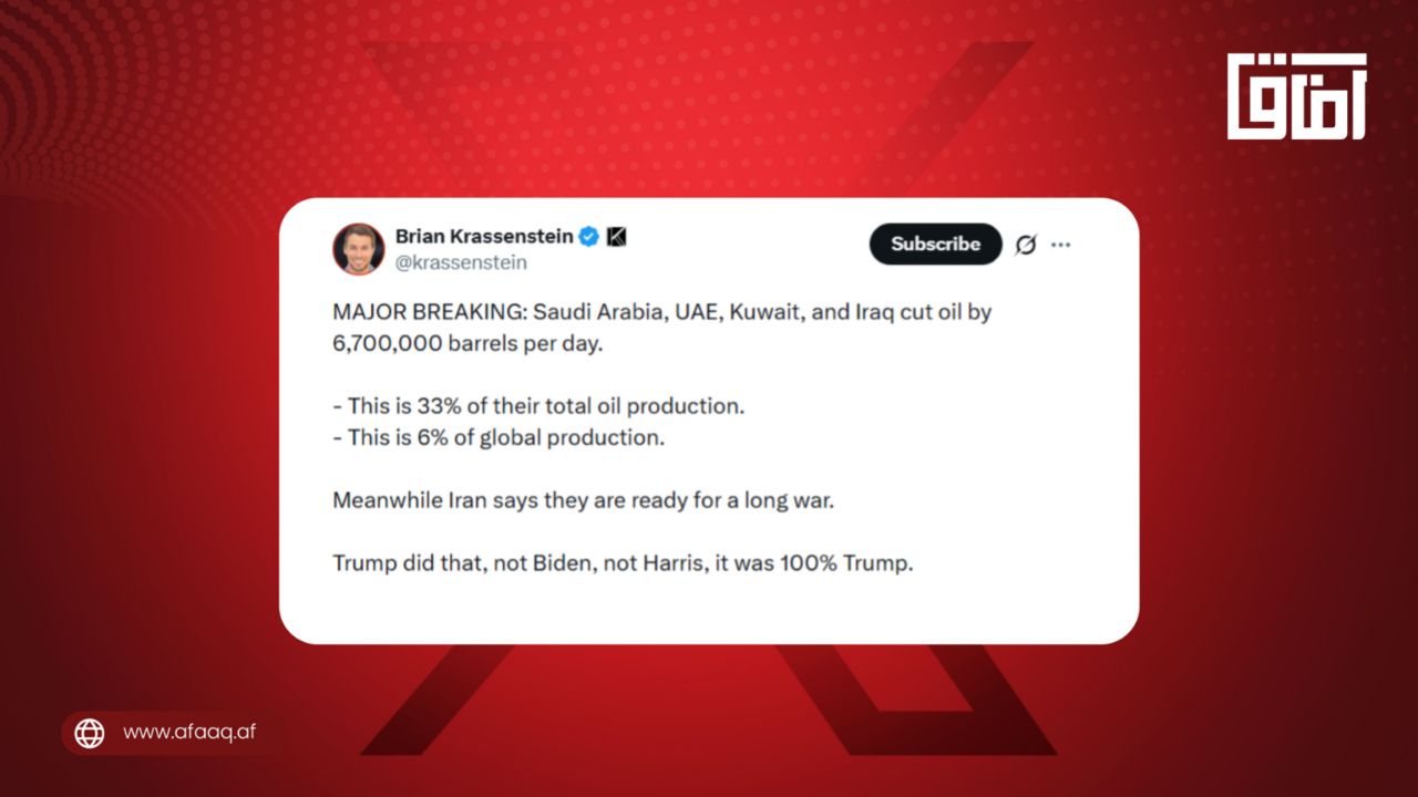 د ټرمپ ضد اینفلونسر برایان کراسنشټاین، پر خپله ایکسپاڼه لیکلي: «سعودي عربستان، متحده عربي امارات، کویټ او عراق د خپلو نفتو تولید هره ورځ ۶.۷ میلیونه بېرلو ته راکم کړی...