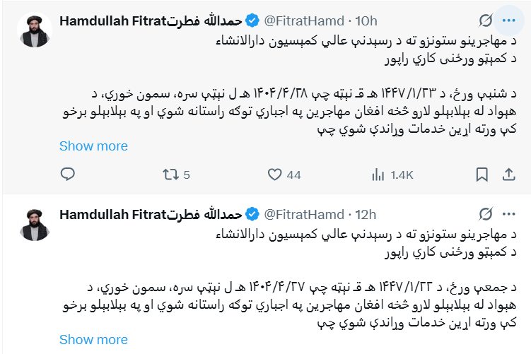 په یوه ورځ کې له پاکستان او ایران ۱۵۷۶ کورنۍ راستنې شوې