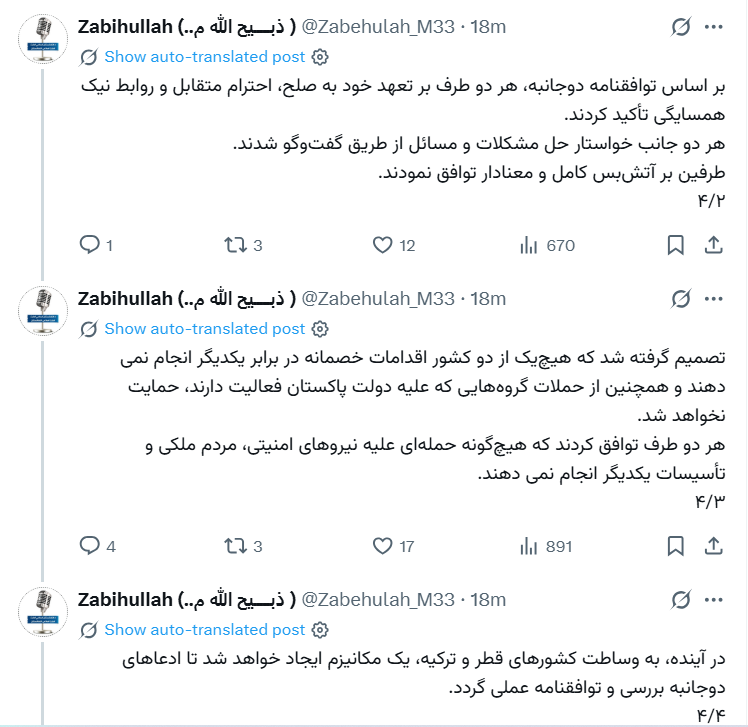 مجاهد: دوحه کې هوکړه وشوه چې پاکستان او افغانستان به د یو بل پر وړاندې خصمانه کړنې نه کوي