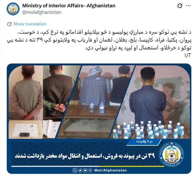 کورنیو چارو وزارت: نهو ولایتونو کې ۳۹ تنه د نشهیي توکو قاچاق په تور نیول شوي