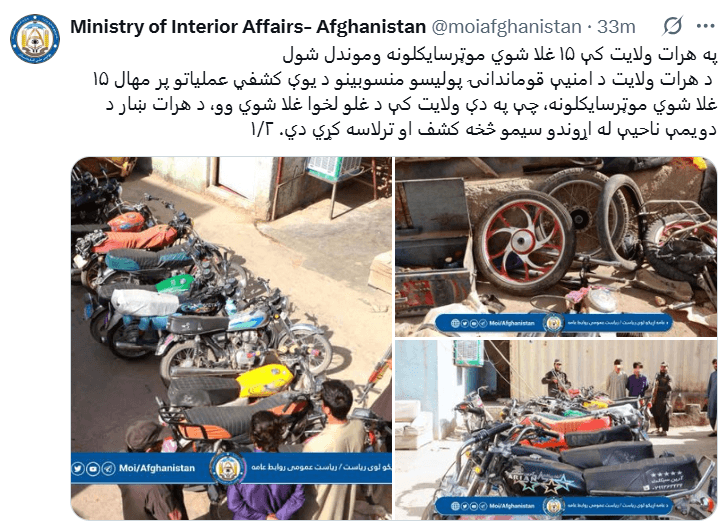 هرات کې امنیتي ځواکونو ۱۵ غلا شوي موټرسایلکونه ترلاسه کړي دي