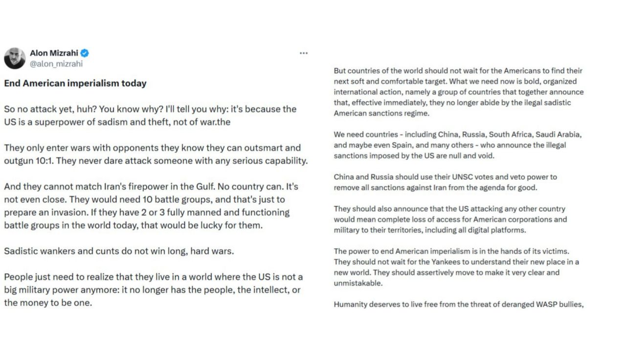 آلون میزراهی، نویسنده و تحلیلگر اسرائیلی، در پیامی در شبکه های اجتماعی با لحنی تند، سیاست ها و نقش ایالات متحده در تحولات جهانی را به شدت مورد انتقاد قرار داد. او در این مطلب خود مدعی شد که آمریکا دیگر یک قدرت بزرگ نظامی نیست و توان ورود به جنگ های طولانی و پرهزینه را ندارد.