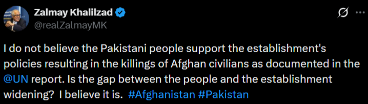 من باور ندارم که مردم پاکستان از سیاستهای حاکمیت این کشور که به کشتهشدن غیرنظامیان افغان انجامیده و در گزارش سازمان ملل نیز مستند شده است، حمایت کنند. آیا شکاف میان مردم و حاکمیت در حال عمیقتر شدن است؟ من باور دارم که چنین است.