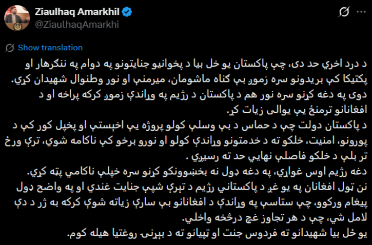 درد به اوج خود رسیده، چرا که پاکستان دوباره با ادامه جنایات گذشته خود، در ننگرهار و پکتیکا به حملاتی دست زده است که در نتیجه آن، کودکان بیگناه، زنان و دیگر هموطنان ما شهید شدند.