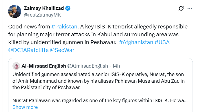 خانه / شبکه های اجتماعی / خلیلزاد: کشته شدن عضو داعش-خراسان در پاکستان خبر خوش است