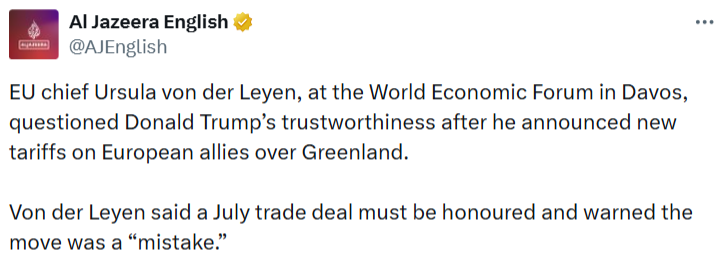 اورزولا فوندرلاین، رئیس کمیسیون اروپا، در حاشیه نشست مجمع جهانی اقتصاد در داووس، اقدام دونالد ترامپ در اعلام تعرفههای جدید علیه متحدان اروپایی بر سر موضوع گرینلند را مورد انتقاد قرار داد و اعتمادپذیری او را زیر سؤال برد.