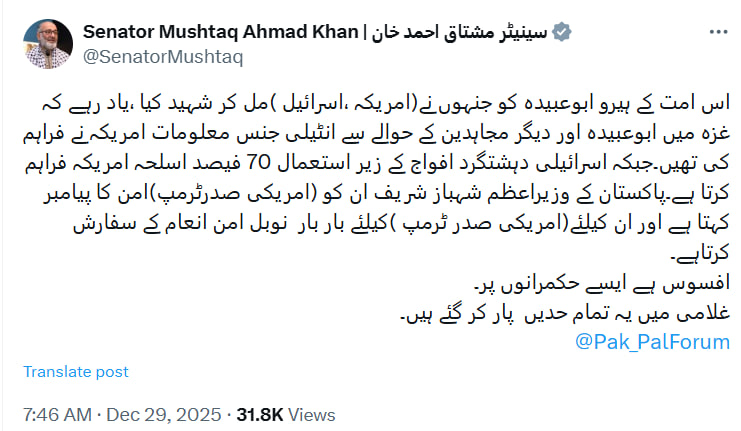 وی افزوده است: «اسرائیل و امریکا قهرمان این ملت، ابوعبیده را به شهادت رساندند؛ اما شهباز شریف، نخستوزیر پاکستان، ترمپ، رییسجمهور امریکا را «پیامبر صلح» میخواند و بارها جایزه صلح نوبل را برای او توصیه میکند.»