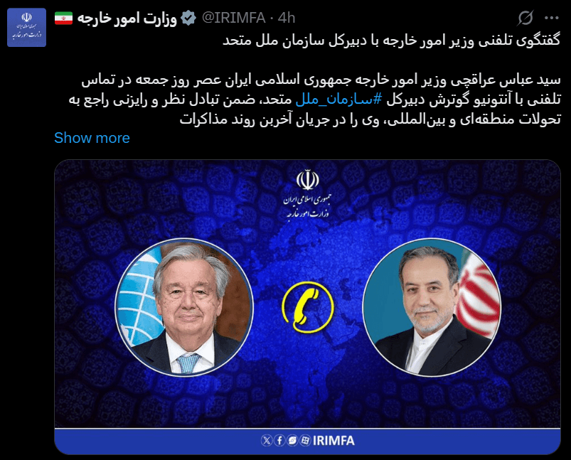 سیدعباس عراقچی راجع به تحولات منطقه‌ای و جهانی با آنتونیو گوترش گفت‌وگو کرد