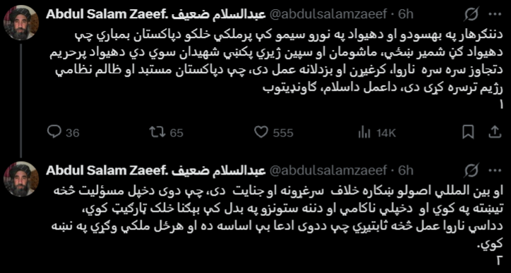 عبدالسلام ضعیف، سفیر پیشین امارت اسلامی در پاکستان، در واکنش به حملات شب گذشته ارتش پاکستان گفته است که این اقدام نقض آشکار حریم هوایی افغانستان و عملی ناروا، ناپسند و بزدلانه است که از سوی رژیم نظامی مستبد و ظالم پاکستان انجام شده است.