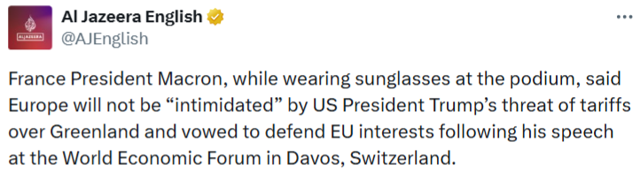 رئیس جمهور فرانسه، امانوئل ماکرون، در سخنرانی خود در مجمع جهانی اقتصاد در داووس اعلام کرد که اروپا از تهدید رئیسجمهور آمریکا، دونالد ترامپ، برای اعمال تعرفه بر گرینلند «تحت تأثیر قرار نخواهد گرفت». وی همچنین تأکید کرد که دفاع از منافع اتحادیه اروپا اولویت پاریس است