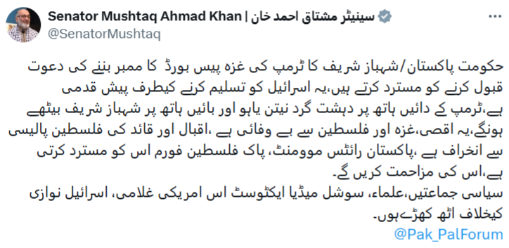 سناتور پیشین پاکستانی، مشتاق احمد خان، در واکنش به موضوع دعوت از شهباز شریف برای عضویت در «هیأت صلح غزه» از سوی دونالد ترامپ، در پیامی در شبکه اجتماعی ایکس (توییتر سابق) این اقدام را به شدت مورد انتقاد قرار داد.