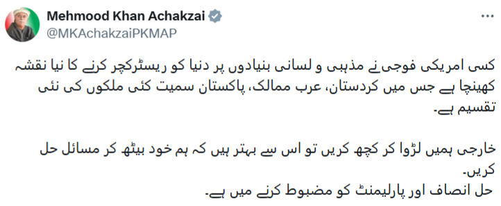 محمود خان اچکزی سیاستمدار ملی گرای پشتون پاکستانی، در پیامی در شبکه اجتماعی ایکس، با اشاره به انتشار نقشه ای منسوب به یک نظامی آمریکایی درباره بازترسیم جهان بر مبنای خطوط مذهبی و زبانی، نسبت به پیامدهای چنین رویکردی هشدار داد.