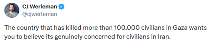 او گفته است: «کشوری که بیش از ۱۰۰هزار غیرنظامی را در غزه کشته، حالا باور میکنید که واقعاً نگران جان غیرنظامیان در ایران است.»