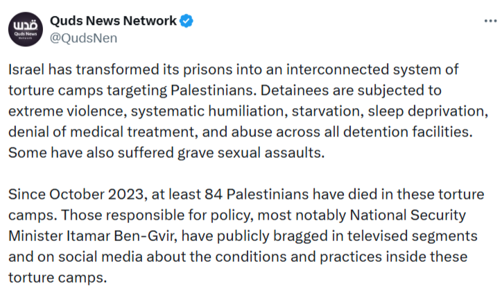 بر اساس گزارش ها، اسرائیل زندان های خود را به شبکه ای به هم پیوسته از مراکز بازداشت تبدیل کرده است که در آن ها فلسطینیان با شکنجه و بدرفتاری سیستماتیک مواجه اند. گفته می شود بازداشت شدگان در این زندان ها تحت خشونت شدید، تحقیر سازمان یافته، گرسنگی، محرومیت از خواب، جلوگیری از دسترسی به خدمات درمانی و انواع سوءرفتارها قرار دارند. منابع همچنین از وقوع موارد جدی آزار و تجاوز جنسی علیه برخی زندانیان خبر می دهند.