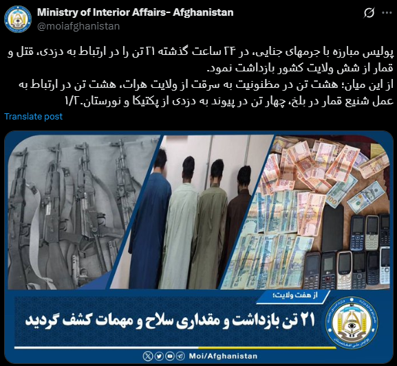 در ۲۴ ساعت گذشته، ۲۱ تن به اتهام جرایم مختلف در شش ولایت بازداشت شدند